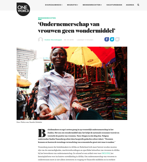 In an interview with OneWorld magazine our PhD researcher Saskia Vossenberg discusses the current 'vibe' around female entrepreneurship as a way to increase economic development and the position of women in society: “the concept of female entrepreneurship as such isn't wrong. It's a good thing to improve attention for entrepreneurship among women! However, the implementation of current policies often lacks efficiency"
